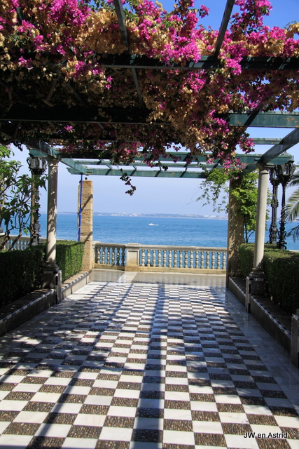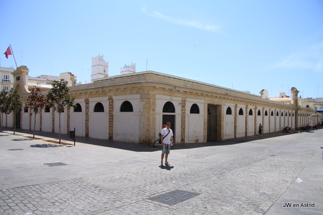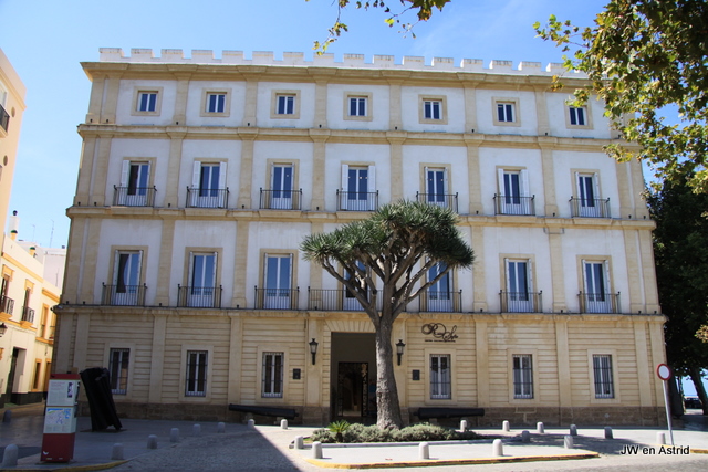 Het is ongeveer 30 kilometer rijden en vrij eenvoudig komen we aan in Cadiz. Het is zondag en lekker zonnig, de Spanjaarden gaan massaal naar het strand. Het duurt daardoor eventjes eerdat we het centrum van Cadiz bereiken. We parkeren in een parkeergarage vlak bij het neoklassieke Ayuntamiento. Tegenover het Gemeentehuis starten we eerst met een espresso. In het Capitool Sevilla/Andalusia staat een wandelroute door Cadiz, die we gebruiken om alle high lights van Cadiz mee te krijgen. De start is het Ayuntamiento en vervolgens wandelen we via schaduwrijkje smalle straatjes en pleintjes richting de kust. Aan de kust staat een lekker windje, het is 27 graden. De temperatuur scheelt aanzienlijk met Jerez, waar het ongeveer 8 a 10 graden warmer was. Het is hier wel klef warm, in vergelijking met de droge warmte wel even wennen.