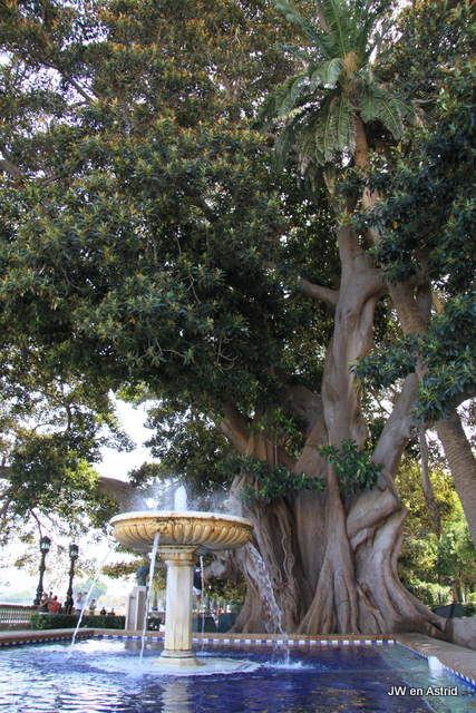 We wandelen langs de Murrallas de San Carloes, de tuin met grote drakenbloedbomen Alameda Apodaca en Parque Genovés met een laan waar prachtige symetrische vormsnoeibomen staan.
