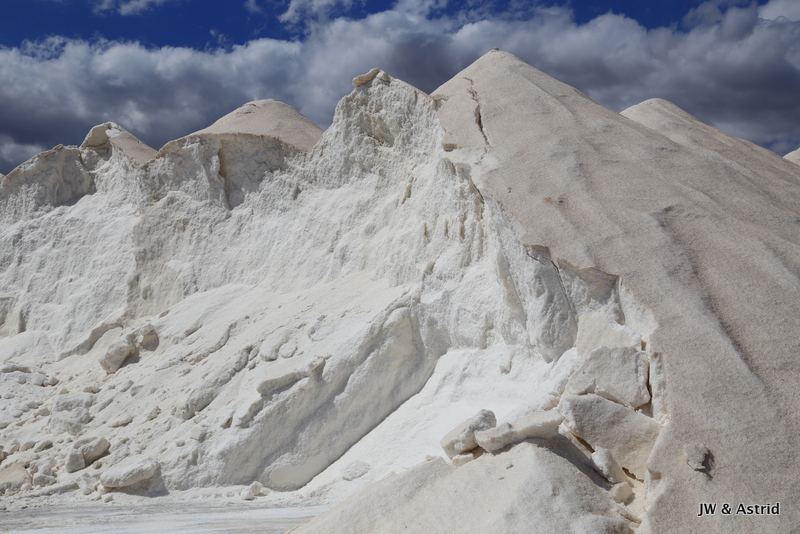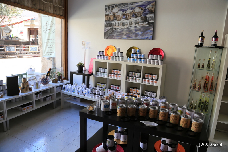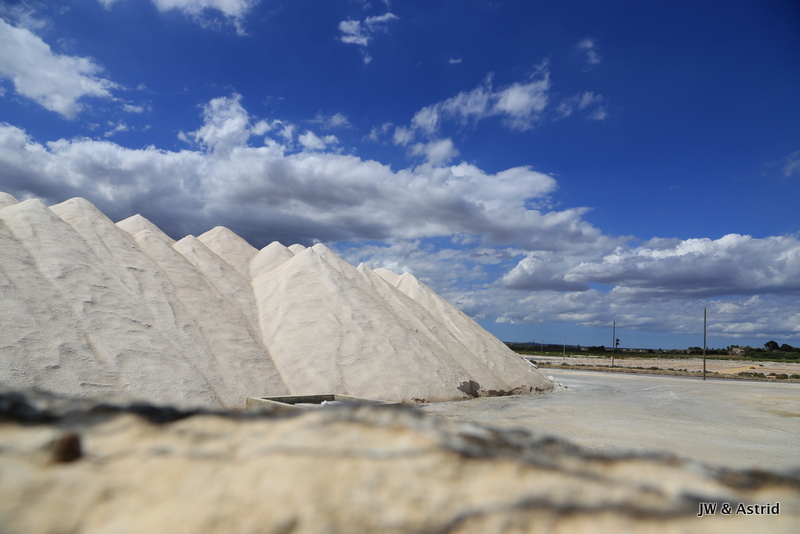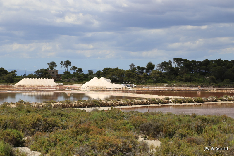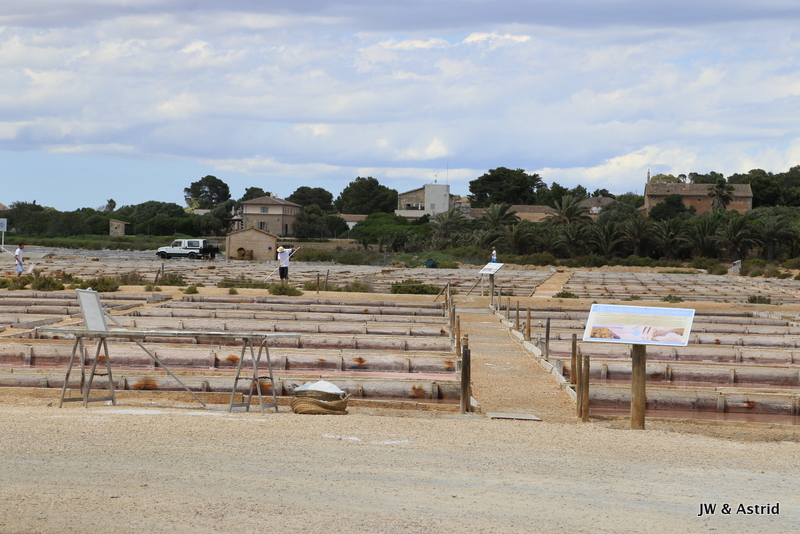 Op een rots nemen we plaats, die dient niet alleen als tafel maar biedt ook beetje bescherming tegen de wind. We smullen van de heerlijk verse broodjes, croissants en cakejes. We wandelen op ons gemak terug naar de auto en rijden door richting Colonia de Sant Jordi. Het is ons nog steeds niet duidelijk waar we de zoutpannen kunnen bewonderen. De route is echt prachtig. De omgeving bestaat voornamelijk uit olijfbomen, amandelbomen, mooie molentjes en uitgestrekte vlakten. Wellicht ook bomen waar vruchten aan groeien, maar die kunnen we nu niet ontdekken. Aangekomen bij Colonia de Sant Jordi rijden we bij toeval langs de zoutpannen en ook Salinas d’Es Trenc die ook excursies organiseert is eenvoudig te vinden. De Romeinen hebben hier vroeger al zeezout gewonnen, het is nu een beschermt natuurgebied. Pas in 1945 is men begonnen met het industrialiseren van de zoutwinning. Het kwalitatief goede zeezout wordt wereldwijd geëxporteerd. Het is bij elkaar geen enorm grote oppervlakte en een tour van 90 minuten hebben we niet veel zin in. Maar, we vinden het wel erg interessant en leuk om dit natuurgebied gezien te hebben.