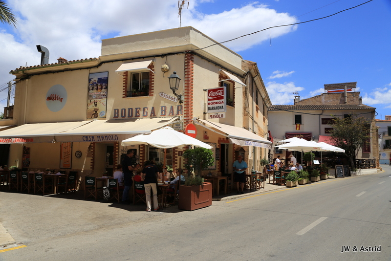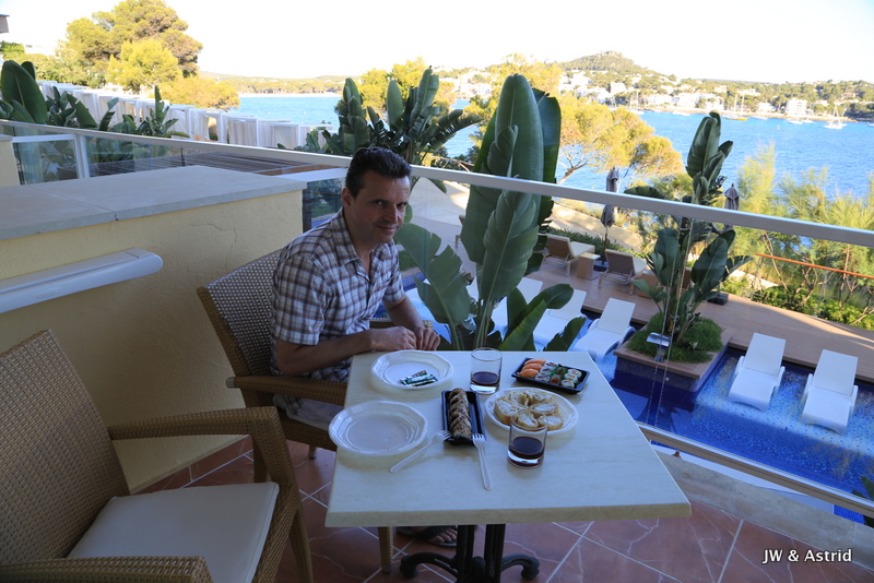 Via de toeristische route rijden we op ons gemak weer terug naar Santa Ponsa. De omgeving is echt fraai en relaxed. Aangekomen bij Santa Ponsa besluiten we eerst nog eventjes het andere deel van Santa Ponsa, het deel waar wij vanuit ons hotel op uitkijken, aan te doen. Het centrum is een lange winkelstraat waar veel dicht is omdat het zondag is. Bij een supermarkt gaan we op zoek naar water. Een meisje biedt mensen sushi aan om te proeven, omdat het ons eigenlijk best goed smaakte besloten we twee doosjes mee te nemen en een vers stokbrood met kruidenkaas. We hebben in het hotel een studio met een heel klein keukentje, maar zonder toebehoren geen borden, pannen. We kunnen er met dit soort kant en klare hapjes goed met uit de voeten. In de plaats van bij een restaurant te eten, genieten we heerlijk op ons eigen terras van de sushi. Wijntje erbij, helemaal goed…..