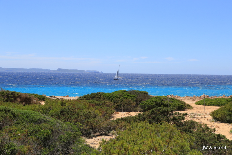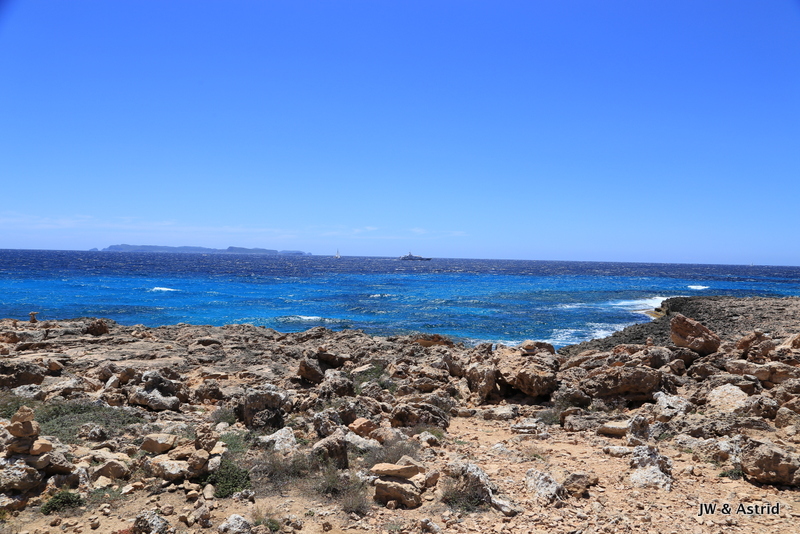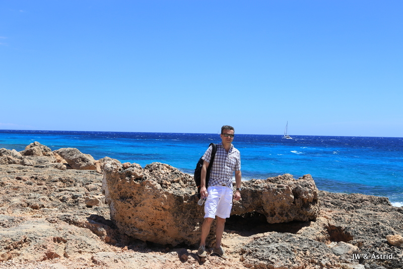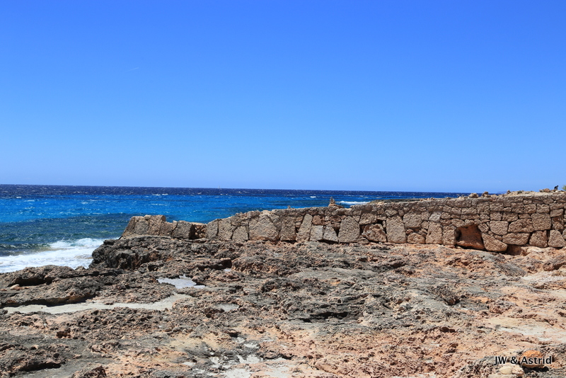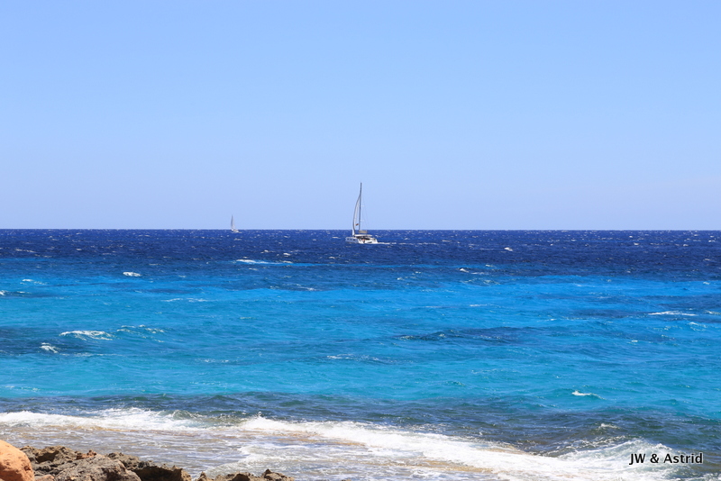 Rond 12 uur gaat we op pad met de auto om het zuiden van Mallorca te verkennen. We rijden via de ring van Palma richting LLucmajor om via Campos uit te komen bij Ses Salines. Het plaatsje staat bekend om zout (Spaans: Flor de sal) dat gewonnen wordt uit de zoutpannen gelegen vlakbij Colonia de Sant Jordi. Alles is gericht op de verkoop van producten gemaakt met de kwalitatief goede zeezout en dat is blijkbaar succesvol. Het stadje ziet er zeer goed onderhouden uit en straalt veel gezelligheid uit. We kopen verse broodjes bij een luxe Panaderia voor onze picknick en uiteraard in een winkeltje kruiden met de zeezout. We drinken een espresso op een van de gezellige terrasjes en rijden daarna door naar het meest zuidelijke puntje van Mallorca, Cap de Ses Salines. Daar is het veel drukker dan wij hadden verwacht. Er schijnt een populair wit strandje te zijn, dat buiten het geweldige uitzicht, veel bezoekers trekt. En het is zondag, dus ook de eigen bevolking trekt er op uit. Er staat heel veel wind maar het uitzicht is magnifiek. De zee toont vele verschillende kleuren blauw/groen, dat in combinatie met de rotsen en de nabij gelegen eilandjes een erg fascinerend uitzicht biedt. Deze rotsen zijn hetzelfde als waar de Kathedraal en het Kasteel in Palma van zijn gebouwd.