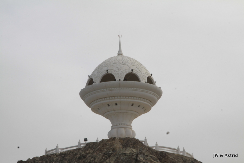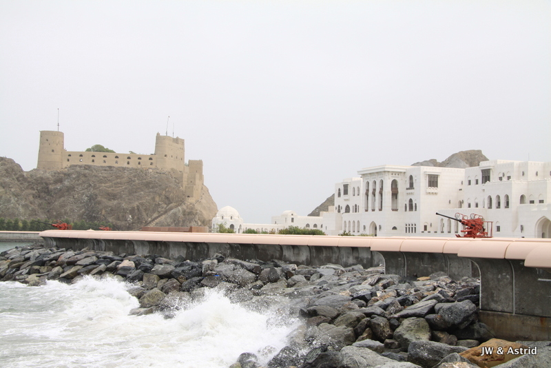 We banen ons een weg door het enorme wegennet van Muscat naar ‘Old Muscat’ en bezoeken het Al Alam Palace. Een flamboyant paleis gebouwd in 1972. Het is van Islamitische ‘design’, twee witte vleugels met een prachtig kleurend centraal midden. De sultan heeft aan de achterkant schitterend uitzicht op de haven en vlak achter het paleis bevinden zich twee forten: Jalali en Mirani.