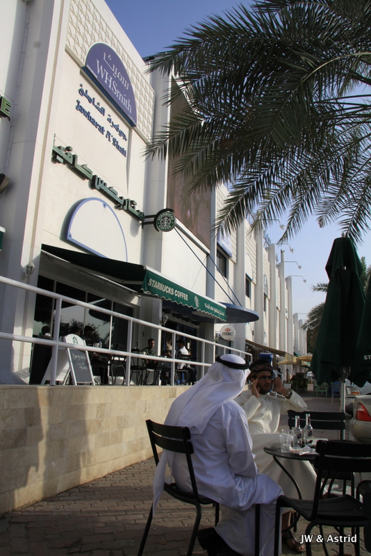 We gaan op zoek naar een Jahwarat Ash Shafi Mall, iets verderop langs de kust. Langzaam komt het zonnetje gelukkig weer tevoorschijn. Vlak voor een tweede Starbucks kunnen we parkeren en zien ook nog eens een Costa op de andere hoek. Hmmm heerlijk, vandaag komt het wel goed met onze koffietjes….We maken eerst een wandeling over het strand en bestellen een Panini bij Starbucks. Er zijn hier zelfs gezellige terrasjes, waar we onze lunch kunnen nuttigen en ondertussen de menigte kunnen aanschouwen. Muscat is duidelijk een verhaal op zich in Oman. Ongetwijfeld verblijft een groot aantal van de bijna 800.000 Expats die Oman ‘rijk’ is, in Muscat.