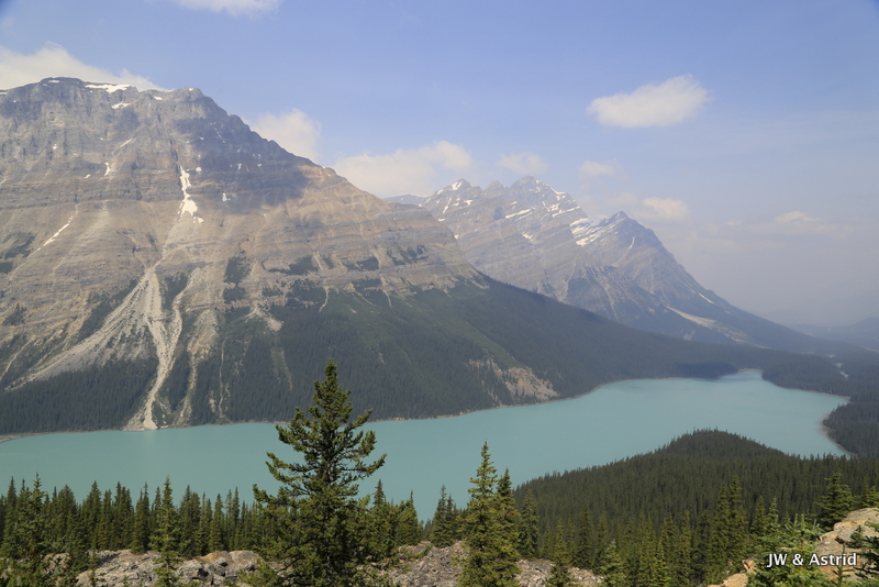 We vervolgen onze route en stappen uit bij Bow Summit en het Peyto Lake. Het meer is te bereiken via een houten wandelpad dat uitkomt bij een vierpoint. Het meer heeft ook weer een bijzondere blauwe kleur, heel fascinerend.