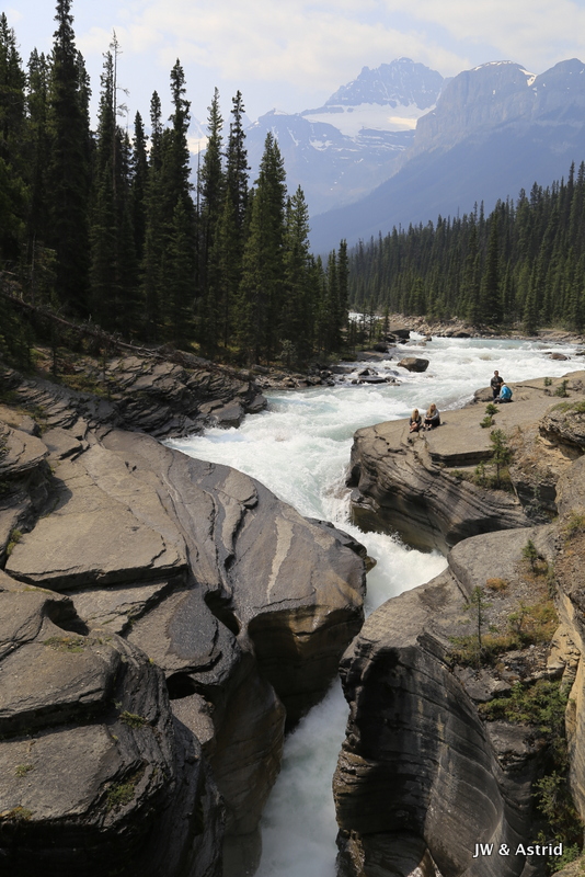 We rijden weer verder en passeren opnieuw een mooie waterval, Tangle Greek deze ligt langs de kant van de weg. En iets verder staan ineens namen van de bergen genoemd inclusief de hoogte, best grappig. Als laatste stoppen we bij de mooie Sunwapta Falls. Alles wat we gelezen hebben over de Icefield Parkway is waar, wat een zeer indrukwekkende magistrale omgeving!!