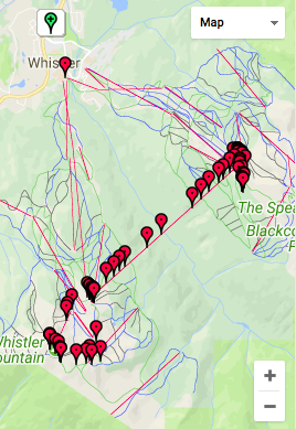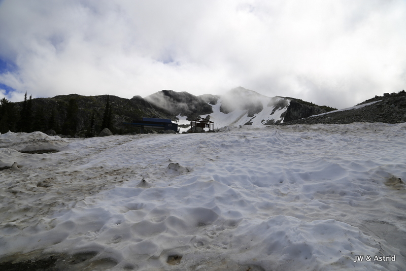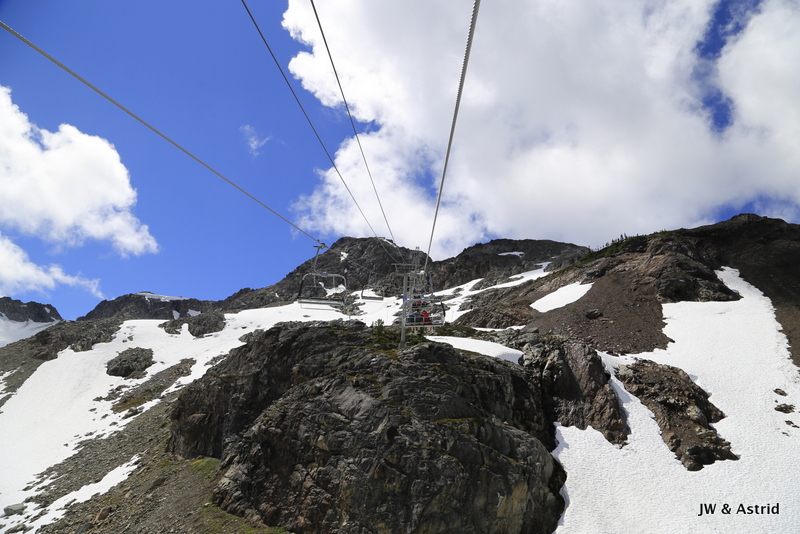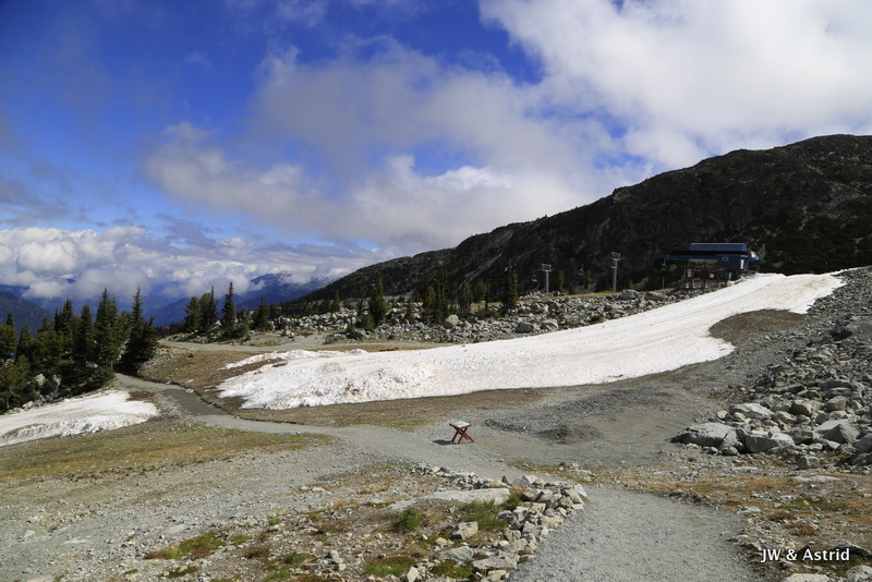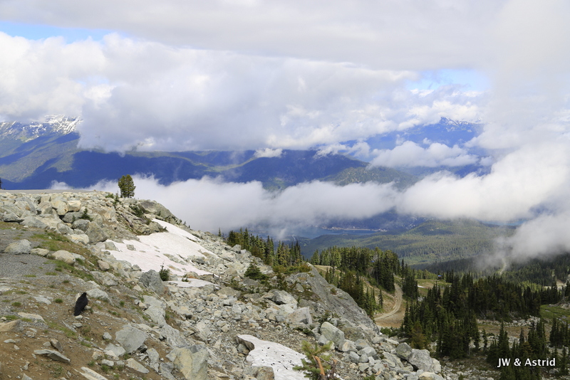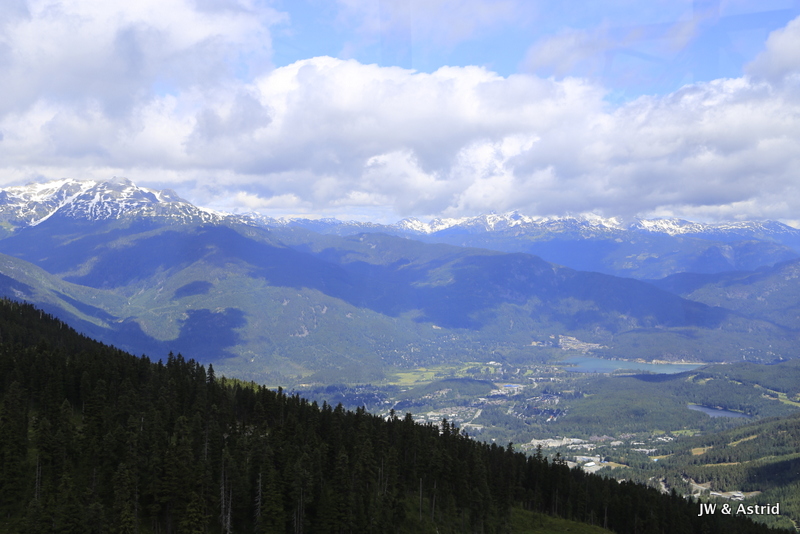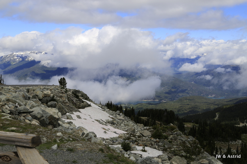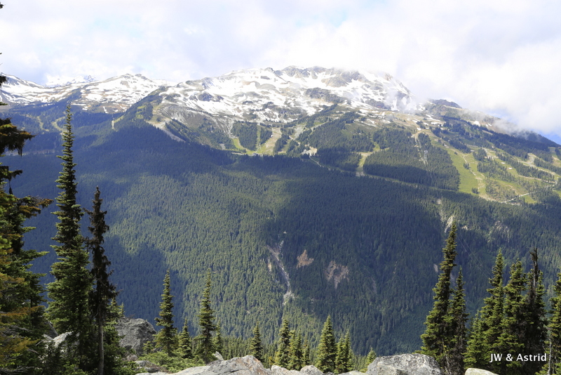 Voor vandaag staan de bergen van Whistler op onze planning. Hopelijk trekt de bewolking weg en zijn de gondola en liften in werking. Rond 9.00 uur wandelen we naar de Gondola en zien tot onze vreugde dat die open gaat om 9.30 uur. We kopen tickets die geldig zijn voor alle gondola’s en skiliften, maar beperkt zijn tot 1 keer vanaf Whistler village omhoog en 1x omlaag. Het is nog wat bewolkt maar hier en daar klaart de lucht op en piept het zonnetje tevoorschijn. Om 9.30 uur gaan we met de gondola vanaf Whistler village omhoog naar de Whistler Mountain waar we uitstappen bij de Rondhouse Lodge. We bewonderen het geweldige uitzicht en komen aan de praat met een parkmedewerker die geeft ons nog wat tips die heel bruikbaar zijn voor vandaag qua wandelroutes. Zie voor meer trials/wandelroutes Whistler Mountain en Blackcomb Mountain: Whistler maps