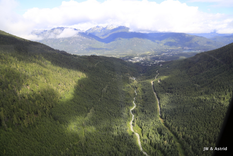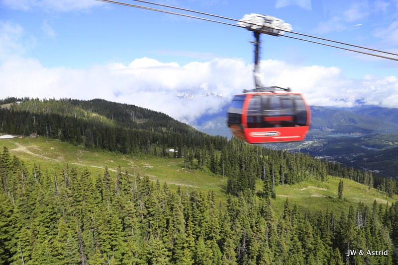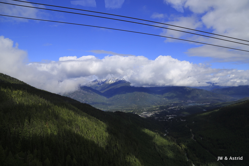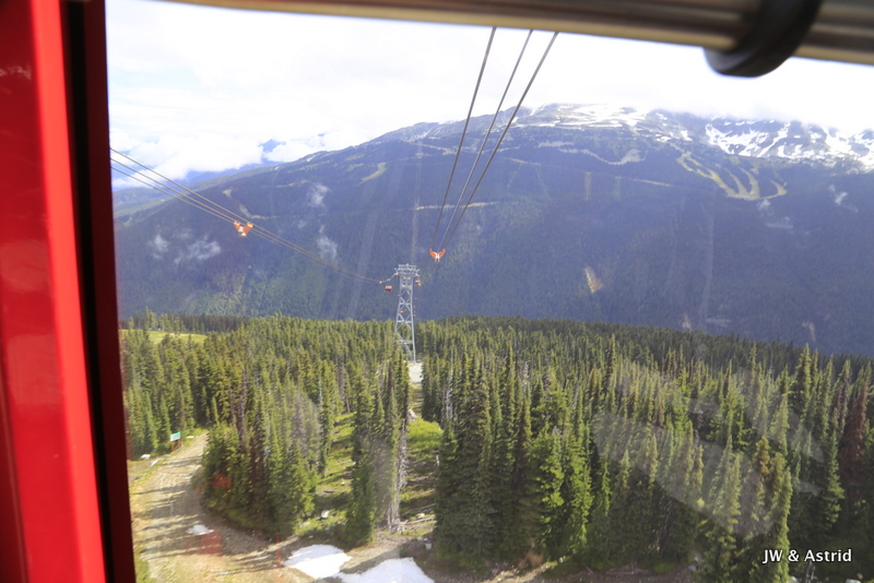Vervolgens gaat de Peak-2-Peak gondola open en kunnen we direct mee. Het is de langste Peak-2-Peak gondola rit ter wereld biedt een onovertroffen uitzicht op het dak van British-Columbia. De gondola maakt een rit van maar liefst 4,4 kilometer, een Guinness World Record. Oude gletsjers, vulkanische pieken en zelfs het regenwoud bij de kust kan op een heldere dag vanuit de gondola gezien worden. De rit biedt ons een weids zicht op deze wonderschone omgeving, maar door de bewolking kunnen wij de kust vandaag niet zien.