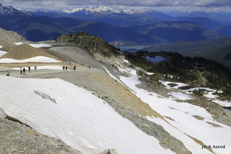 We volgens de Alpine trail op de Blackcomb Mountains, van zo’n 45 minuten. Daarna nemen we de Peak-2-Peak terug naar de Whistler Mountain. Het zonnetje komt steeds vaker door, wat het qua temperatuur een stuk aangenamen maakt. Vanaf de Whistler Mountain gaan we met een skilift ‘Peak Express’ naar de ‘Top of the World’ en dat is het. De parkwachter gaf ons de tip dat we in een uur vanaf dat punt naar beneden kunnen wandelen via de Dave Mathew Traverse. Een super tip en wat een geweldig mooie ervaring deze omgeving.
