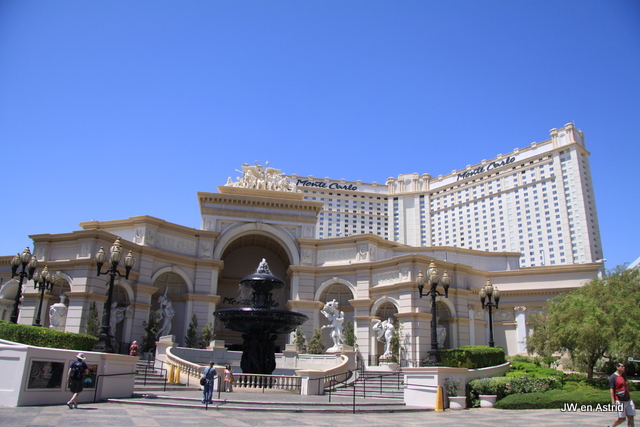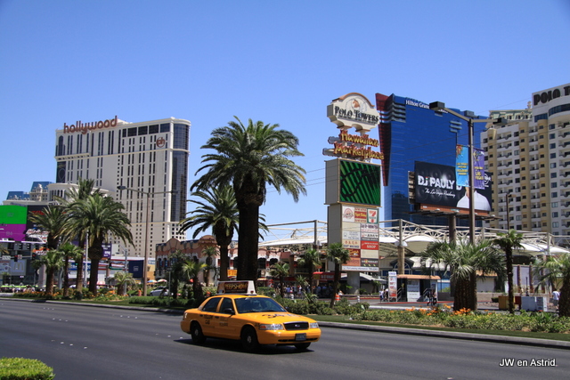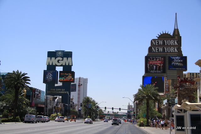 We willen vandaag meer van ‘The Strip’ zien en winkelen. Buitenkomend lopen we tegen een muur van warmte aan, het is zeker 40 graden. Op zich zijn de afstanden langs The Strip niet zo groot, maar de hitte vraagt veel energie. We gaan, net als de meeste mensen, steeds een hotel in. De hotels hebben allemaal een thema en ontvangen graag zo veel mogelijk bezoekers. Ieder hotel heeft een mega casino en veel winkels, men hoopt uiteraard dat mensen de verleiding niet kunnen weerstaan om te gaan gokken. Bij het Aria hotel raken we alweer de weg kwijt, we raken erdoor geirriteerd. Het is zo groot en als je naar buiten wil en dat gaat niet, voelt de omgeving beklemmend. We vermaken ons met het bekijken van alle hotels en bezoeken veel winkels. We wisselen buiten lopen met binnen lopen af. Buiten is het té heet en binnen té koud door de airco. Alleen in hotel Venetia is het binnen echt comfortabel. We kopen een lekkere sandwich bij Early Sandwich en gaan rond 16.00 uur terug naar het hotel.