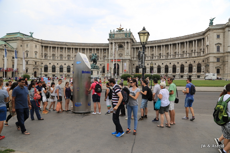 Onder het poortje van de Hofburg doorlopend ontdekken we nog meer pracht en praal die we al op een maquette hadden gezien en waar we nieuwsgierig naar waren of die gebouwen er ook nog steeds waren. Het blijkt dat het enorme gebouw, dat ook onderdeel is van de Hofburg, de Oostenrijkse Nationale Bibliotheek is. In de Nationaalbibliotheek worden maar liefst meer dan 200.000 werken tentoongesteld, naslagwerken over de Oostenrijkse geschiedenis, politiek, kunst en boekdrukkunst.