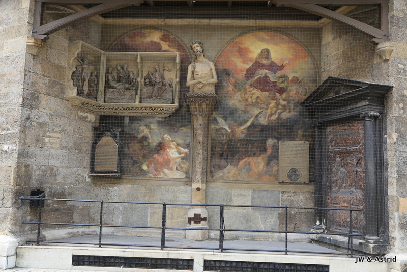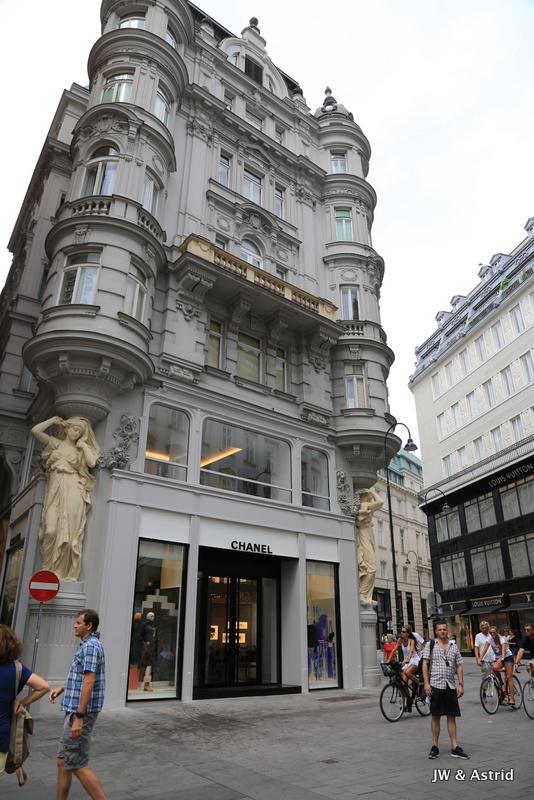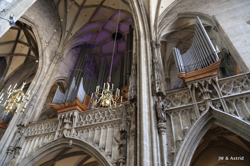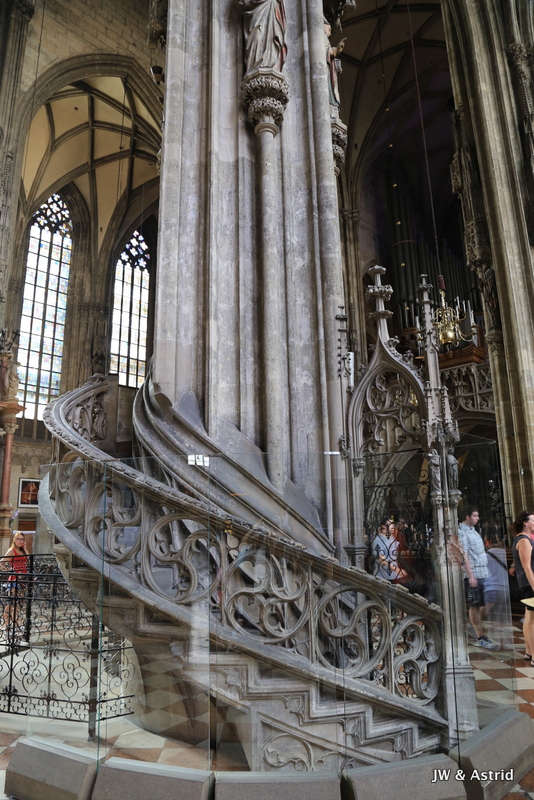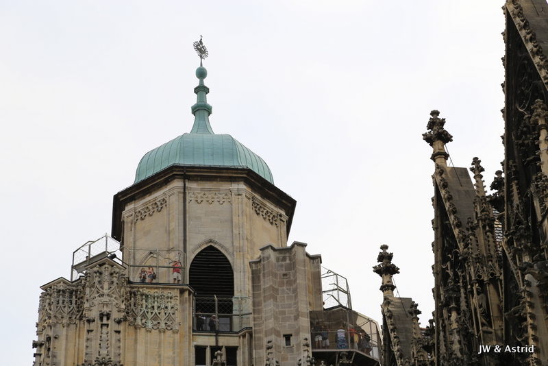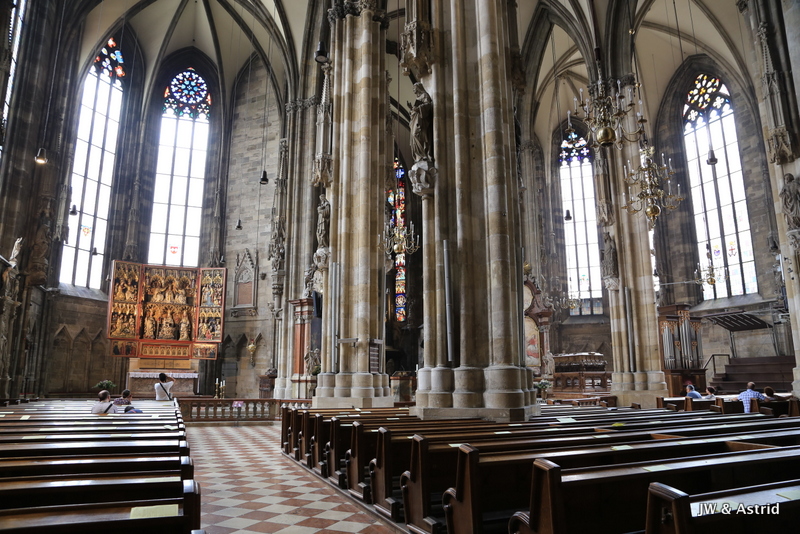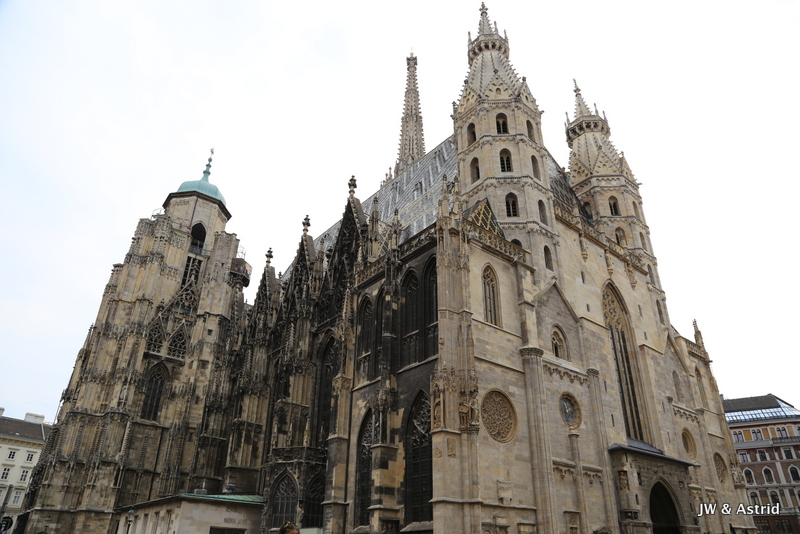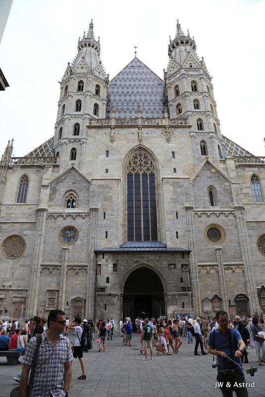 We gaan richting het centrum op zoek naar een lekker broodje, het is opmerkelijk dat veel winkels gesloten zijn. Helaas kunnen we dus niet echt shoppen vandaag in Wenen. 15 augustus is een Nationale feestdag, maar we hadden gelezen dat daar niet veel mee gedaan werd onder andere omdat de winkels open zouden zijn. Er zijn wel wat winkels open maar het merendeel is gesloten. We lunchen bij een Café en wandelen daarna richting de Dom aan de Stephansplatz. Het is een beetje bewolkt, wat op zich wel even voor wat verkoeling zorgt. Voor de ‘plaatjes’ is het wat minder fraai. De Stephansdom in Wenen is meer dan 130 meter hoog en is de blikvanger van de binnenstad en dateert uit de 16de eeuw. Na de Tweede Wereldoorlog werd die herbouwd omdat de dom veel schade had opgelopen in de oorlog.