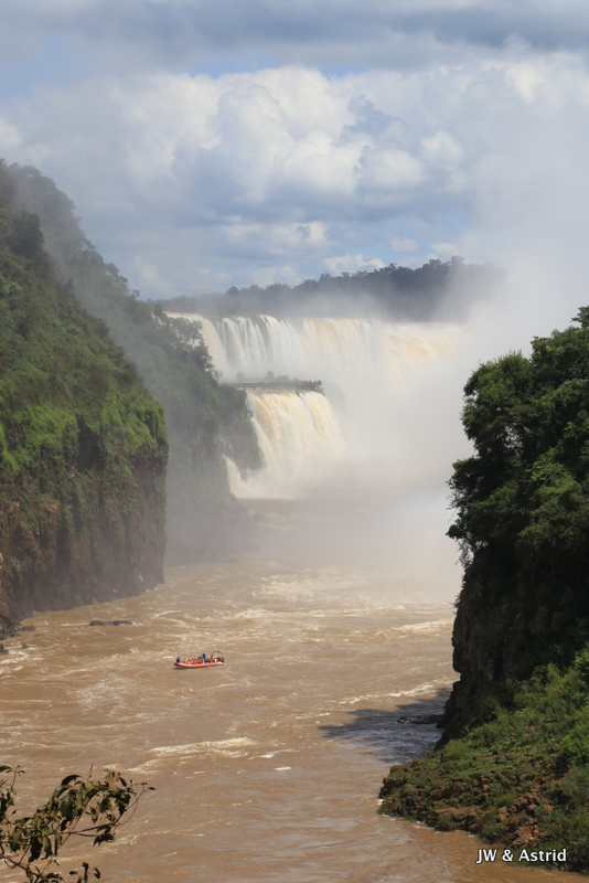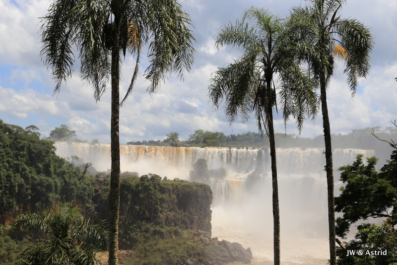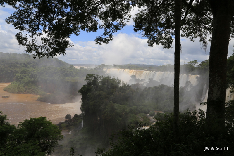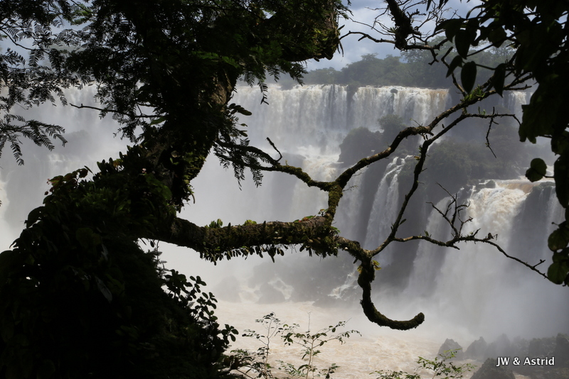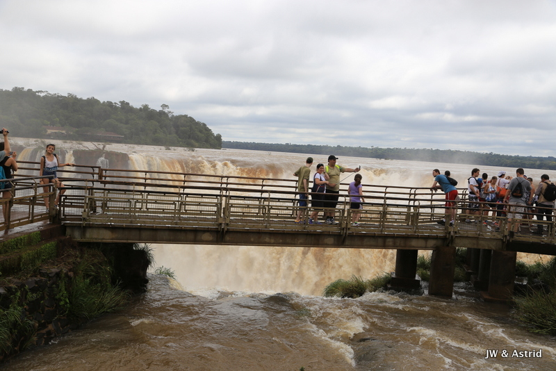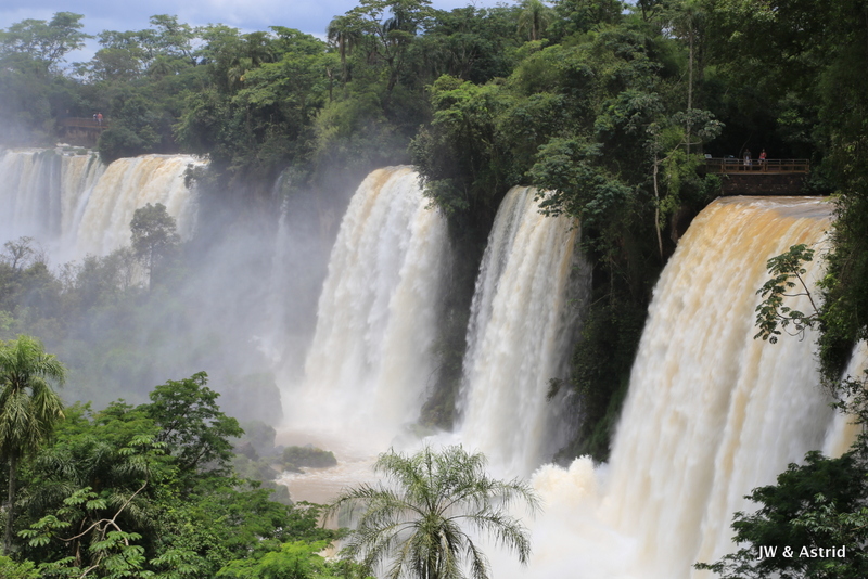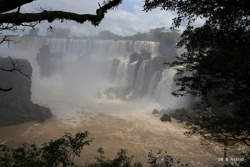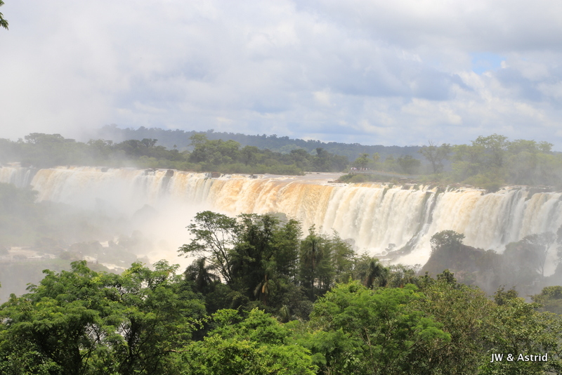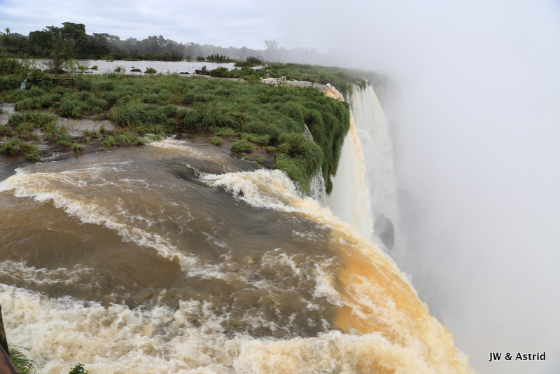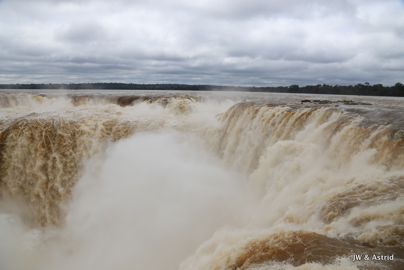 Bij het centrale punt aangekomen dachten wij te kunnen blijven zitten in de veronderstelling dat het boemeltreintje verder ging naar de “keel van de duivel”, maar die vlieger ging niet op. We moesten uitstappen dit treintje ging terug naar de entree en er komt een ander treintje voor de doorreis. Na zo’n 15 minuten konden we weer verder en overbruggen we 2.3 km. Het pad naar het hoogtepunt is spectaculair en zo’n 1100m. Het voordeel van het treintje is dat er steeds een stroom toeristen komen, hun ding doen en weer weg gaan. Vervolgens wordt het lekker rustig en heb je alle ruimte en tijd om het geweld van de watervallen op je gemak te aanschouwen. We hebben de regen ponchos van gisteren bij ons en die hebben we ook hier hard nodig. De “keel van de duivel” is overigens niet goed te zien, door de enorme hoeveelheid opspattend water. De reden dat het water hier en daar overigens bruin is komt door ontbossing van de aanvoer route van het water. Bij alle watervallen valt echt 650.000 liter water per seconde naar beneden, een imposant schouwspel.