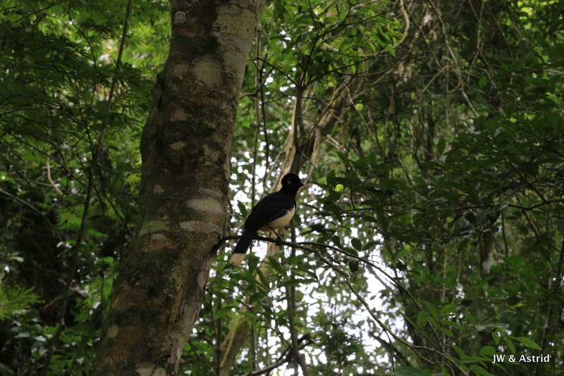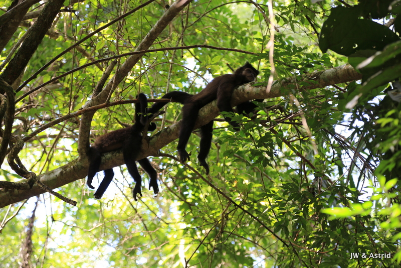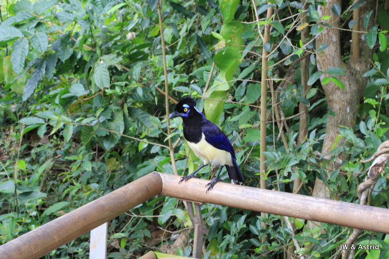 We kopen een broodje voor onderweg bij de Subway. Ook hier heb je heel veel geduld voor nodig, maar ja we moesten wat, de Panaderia in het dorp was dicht vandaag. We besluiten dat de blauwe route aan de beurt is, Circuito Inferior oftewel lower trail. Alhoewel die aangegeven staat als een soort rondje van 1400m is een bepaald deel gesloten, waardoor je weer eenzelfde stuk terug moet lopen. Het zonnetje breekt door en ja hoor daar is de fel begeerde regenboog die ik hoopte te kunnen zien !!! De temperatuur loopt snel op tot zo’n 35 graden en met de hoge luchtvochtigheid wordt het behoorlijk klef. Er zijn veel vlinders in allerlei kleuren, fraaie vogels, lizards, coats, muggen en allerlei ongedierte. Grappig is dat je op veel punten de bezoekers aan de overkant kunt zien.