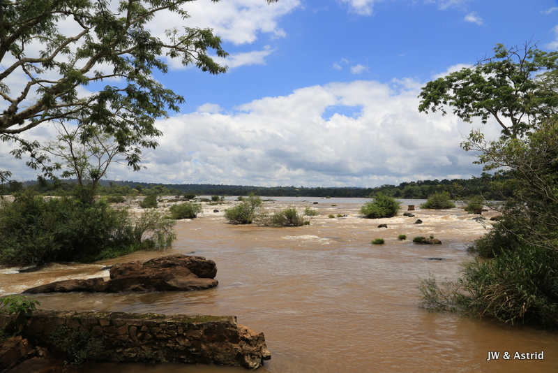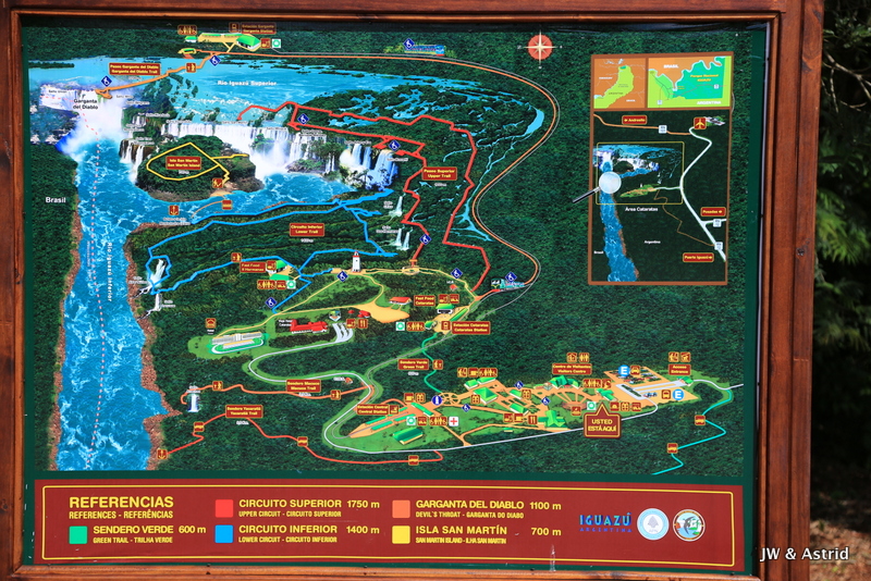 We wachten geduldig op het treintje terug naar het centrale punt, kopen daar een koffie en een paar Empanadas. Echt op je gemak zit je niet, we worden geplaagd door wespen, vliegen en coatis. We gaan snel weer door en kiezen voor de rode route 1750m, de Circuito Superior of upper trail. We weten niet wat we nu mooier vinden de Braziliaanse met het weidse uitzicht of de Argentijnse kant waar je min of meer over de watervallen heen loopt. Wat opvalt is dat hier de watervallen wel allemaal naambordjes hebben die miste ik gisteren aan de overkant.