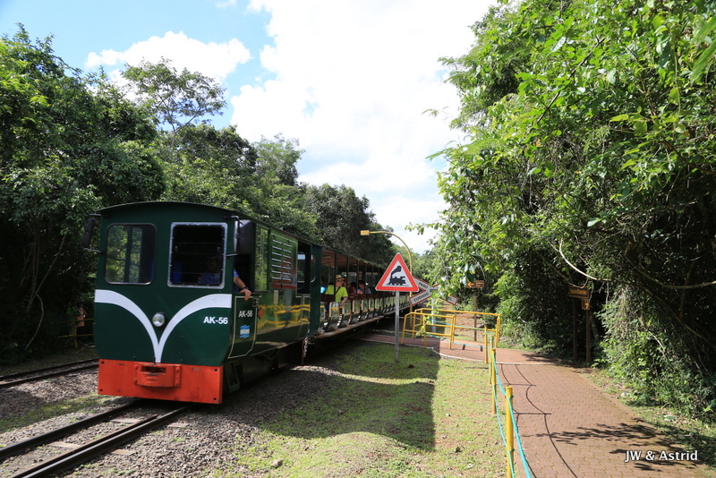 De opzet van Parque Nacional Iguazu is iets anders. Er zijn meer paden waar je over kunt wandelen om de watervallen te bekijken en aan deze kant kan je veel dichter bij de watervallen komen. Er gaat een boemeltreintje vanaf de entree naar het centrale punt waar vandaan alle trails naar de watervallen lopen. Je kunt het ook lopen via de groene route, dat is slechts 600 meter. Wij kiezen ervoor onze krachten wat te sparen en eerst het treintje te nemen.