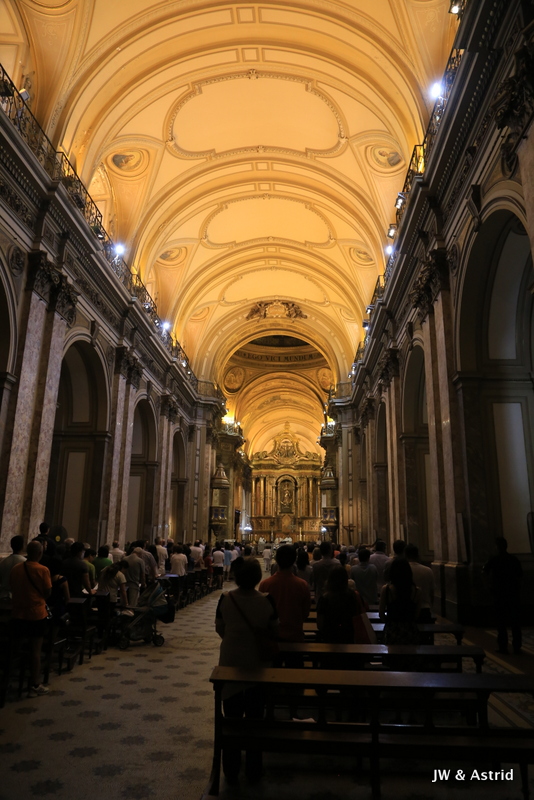 Op zich zit Plaza de Mayo niet in ons plan voor vandaag. Maar als we er toch zijn bekijken we uiteraard ook de Caterdrale Metropolitana de Buenos Aires, waar een mis aan de gang maar waar we toch gewoon naar binnen mogen om de binnenkant maar ook het mausoleum van Generaal San Martin te bekijken. Hij was de leider van de onafhankelijkheidsstrijd van Zuid-Amerika tegen de Spaanse bezetter. Na zijn dood in 1850 kreeg de Argentijnse verzetsheld een prachtig eerbetoon in de Kathedraal van Buenos Aires. Een aparte kapel is volledig ingericht voor hem. Zijn tombe heeft een grote Argentijnse vlag erover heen en de hele dag door staan er twee wachters bij de ingang van het mausoleum.