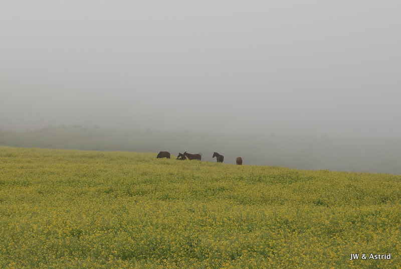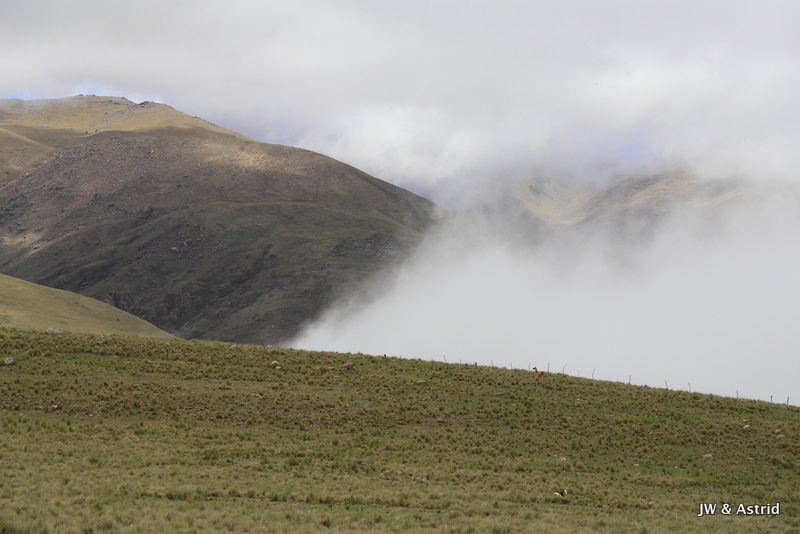 Bij El Mollar worden we verrast met fantastisch uitzicht over een dam. Hoe hoger we komen, hoe kouder en mistiger het wordt. Ineens verandert het landschap, de begroeiing is veel lichter en lager en regelmatig zien we paarden rondlopen. Opeens rijden we de mist uit en een mager zonnetje komt ons tegemoet. Dit is echt bizar, we stoppen en kunnen een muur van mist aanschouwen achter ons. Bij Tafi Del Valle rijden we op een hoogte van 2100 meter. Niet veel verder staan er ineens een groep Lama’s aan de rand van de weg, echt geweldig het lijkt wel alsof we op safari zijn…. We stoppen weer eventjes voor een foto van het opnieuw anders ogende landschap en horen een hoop lawaai van ezels. Als we ze eindelijk gevonden hebben en inzoomen voor een foto komen van rechts Pa, Ma en baby ezel ons tegemoet wandelen op de weg.